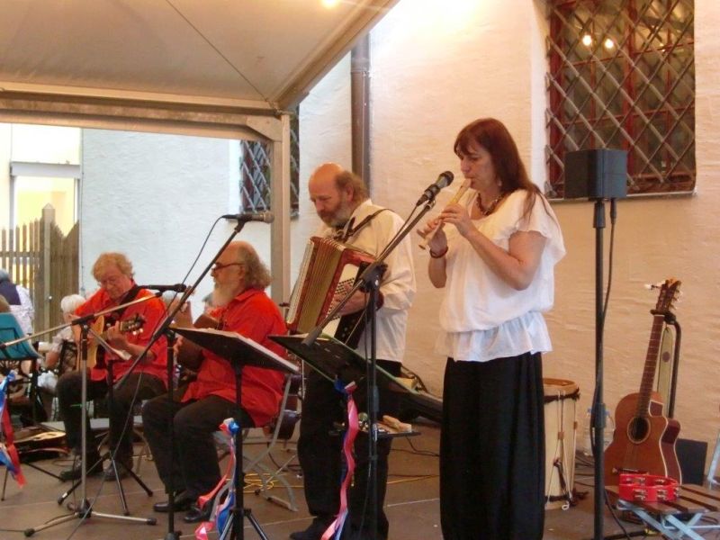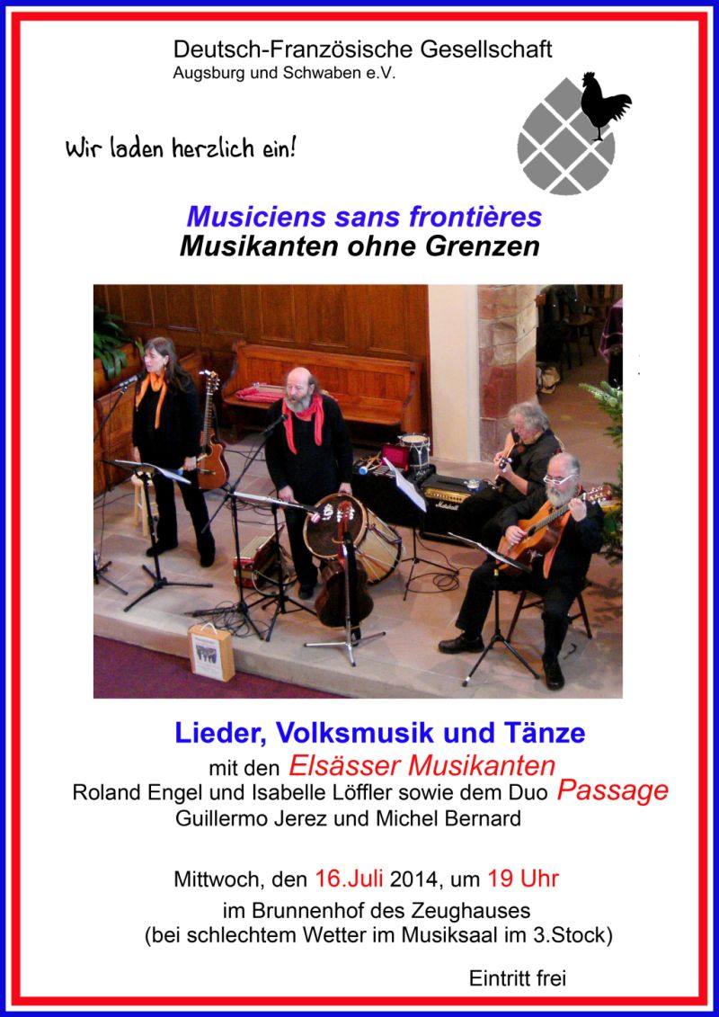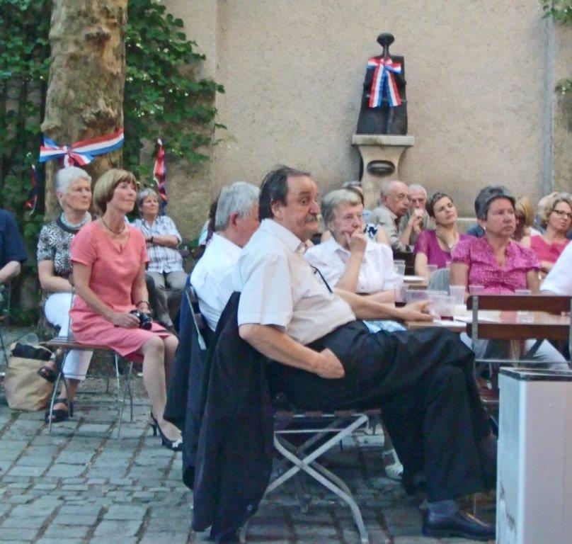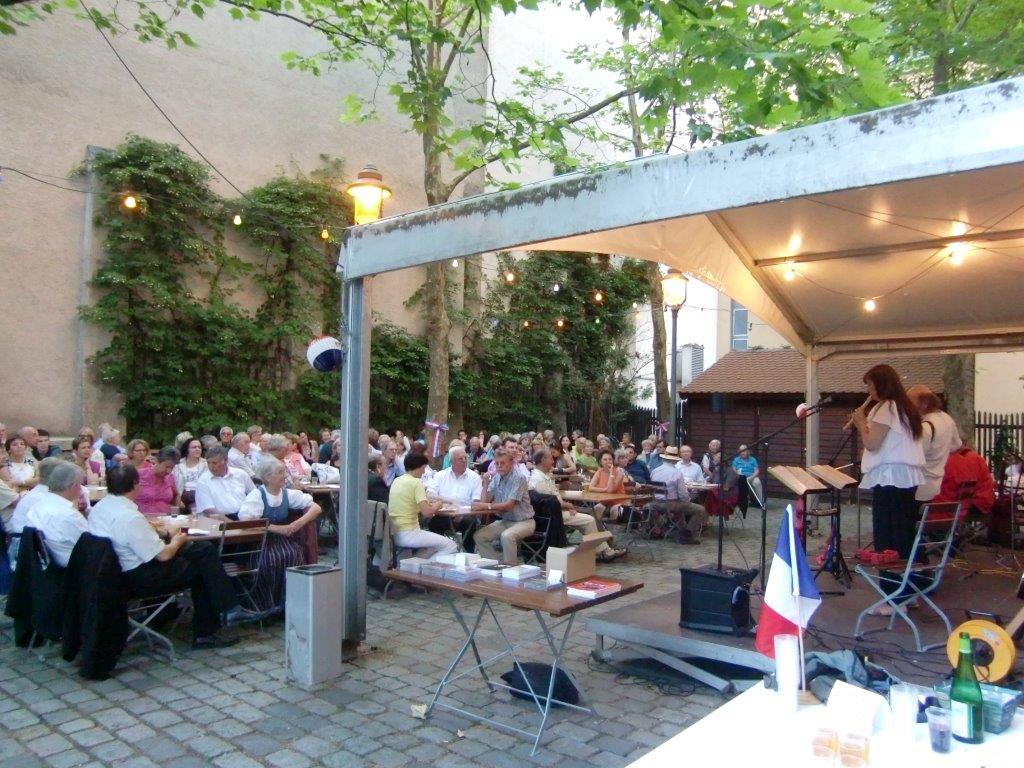 Am 16. Juli lud die DFG Augsburg anlässlich des französischen Nationalfeiertages Mitglieder und Gäste in den mit den französischen Farben geschmückten Brunnenhof des Zeughauses ein. Herr Roland Engel hatte wie schon im letzten Jahr die musikalische Leitung. Er trug zusammen mit Frau Löffler heitere elsässische Volkslieder und Tänze, aber auch tiefsinnige Eigenkompositionen vor. Nachdenklich stimmte unter anderem sein kritischer Text auf die Melodie der französischen Nationalhymne.